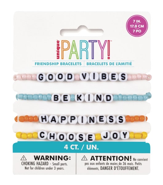 51513 - 4 Friendship Bracelets - Assorted SKU: 51513 Barcode: 011179515134Pack Size: 4Material: PlasticInner Qty:6Outer Qty:72 Please Log in to see price or purchase this item Quantity discounts available QuantityPrice This item is IN STOCK Details 4 Friendship Bracelets - Assorted DetailsBackDetails4 Friendship Bracelets - Assorted