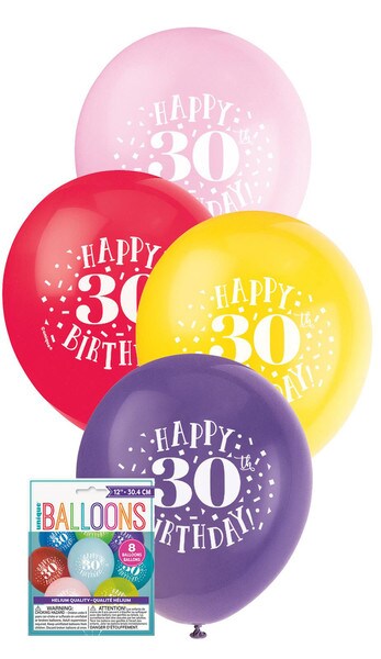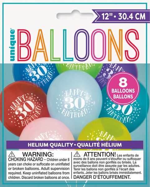 54943 - Happy Birthday "30" 8 x 30cm (12") Balloons - Assorted Colours SKU: 54943 Barcode: 011179549436Age: 30Pack Size: 8Material: LatexSize: 30cmType: BalloonOccasion: BirthdayColour: AssortedInner Qty:12Outer Qty:144 Please Log in to see price or purchase this item Quantity discounts available QuantityPrice This item is IN STOCK Details Happy Birthday "30" 8 x 30cm (12") Balloons - Assorted Colours DetailsBackDetailsHappy Birthday "30" 8 x 30cm (12") Balloons - Assorted Colours