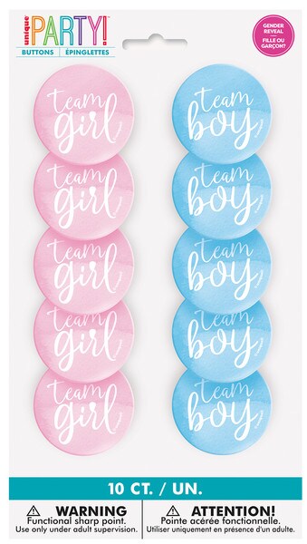 76045 - 10 Gender Reveal Team Boy/Girl Badges SKU: 76045 Barcode: 011179760459Pack Size: 10Collection: Baby RevealMaterial: PlasticGender: NeutralType: BadgeOccasion: Baby ShowerInner Qty:6Outer Qty:144 Please Log in to see price or purchase this item Quantity discounts available QuantityPrice This item is IN STOCK Details 10 Gender Reveal Team Boy/Girl Badges DetailsBackDetails10 Gender Reveal Team Boy/Girl Badges