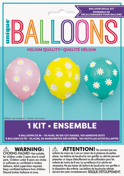 25550 - Daisy Balloon Kit SKU: 25550 Barcode: 011179255504Pack Size: EachMaterial: LatexType: BalloonInner Qty:6Outer Qty:144 Please Log in to see price or purchase this item Quantity discounts available QuantityPrice This item is IN STOCK Details Kit Includes:6 x 30cm (12") Latex Balloons90 x Die Cut Daisies100 Adhesive Dots DetailsBackDetailsKit Includes:6 x 30cm (12") Latex Balloons90 x Die Cut Daisies100 Adhesive Dots